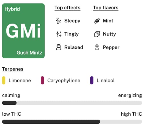 While Gush Mints has a terp profile you may have seen before (the blend of limonene, caryophyllene, and linalool is reminiscent of 2021 SOTY Dosidos), the strain is its own beast with a distinctly chilling, minty flavor. The nearest experience to smoking Gush Mints is picking some berries fresh from the bush, cold air in your lungs, snow under your feet.