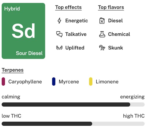 Smoking Sour D is a revelation to the uninitiated. It’s a lightning bolt of cerebral energy, get-up-and-go in a joint. Sour D will have you buzzing from your head to your toes with creativity and social energy, and has been the fuel behind the best stoned conversations for decades. It’s diesel, skunky, caryophyllene-forward terpene profile makes it taste like the spirit of progress, and that distinctive flavor is what has kept it at the forefront of the dispensary ever since there have been dispensaries.