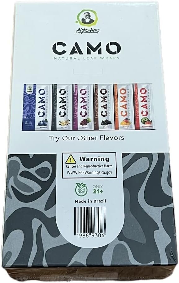 CAMO natural leaf rolling papers full box. 25 packs per box 5 sheets per pack. Comes in multiple flavors. Also includes RSV scoop card.