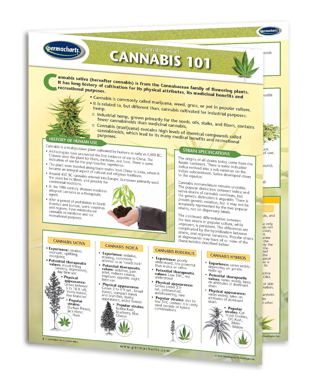 This 4-page, laminated Cannabis 101 quick reference guide provides a good overview of cannabis sativa. The comprehensive chart overs the various strains, cannabinoids, terpenes, decarboxylation, cannabis products and consumption methods.