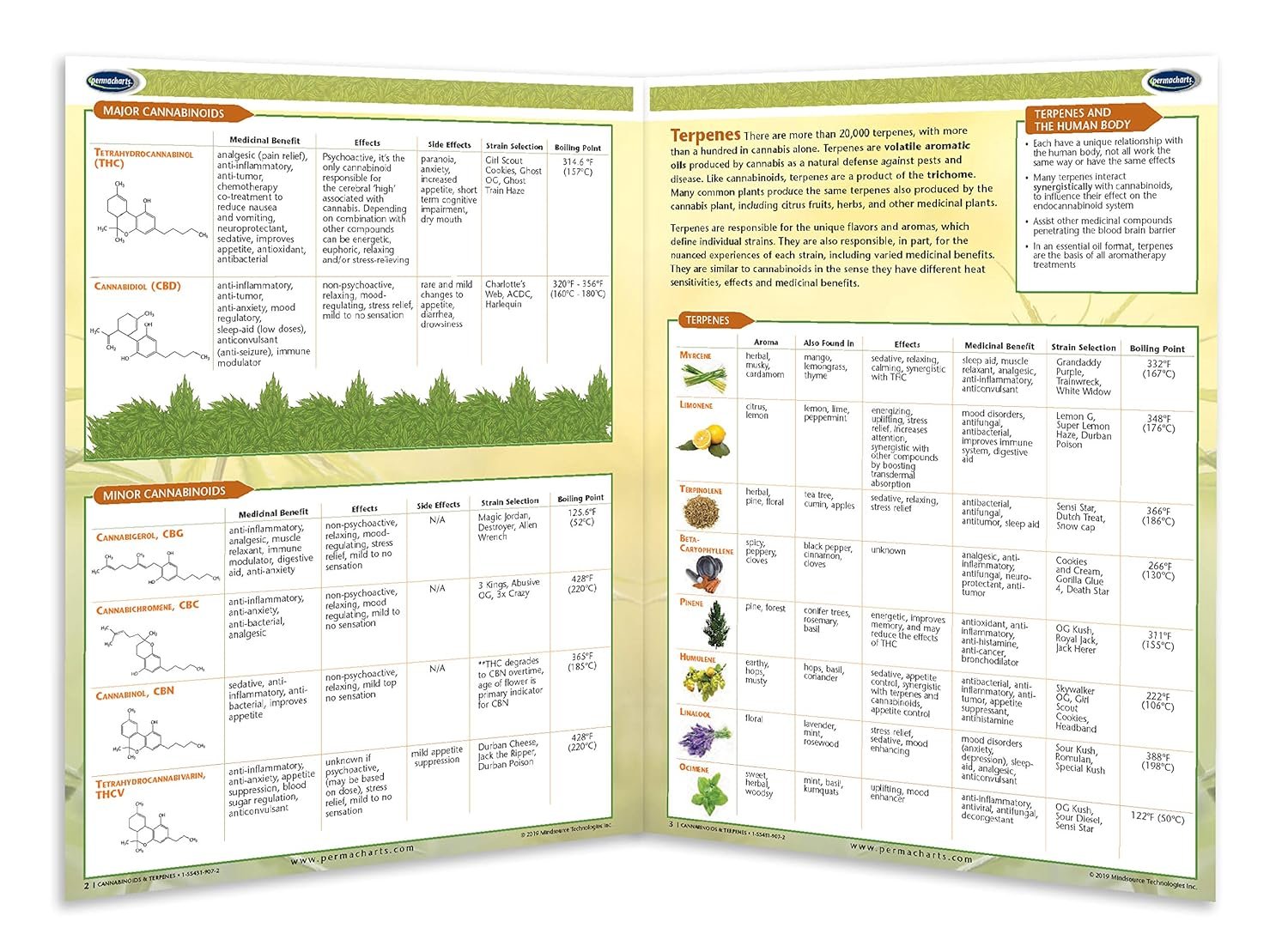 The chart covers cannabinoids and the human body, cannabinoids in cannabis, major and minor cannabinoids. Terpenes and the human body, types of terpenes along with where they are found and the effect or each on the body.