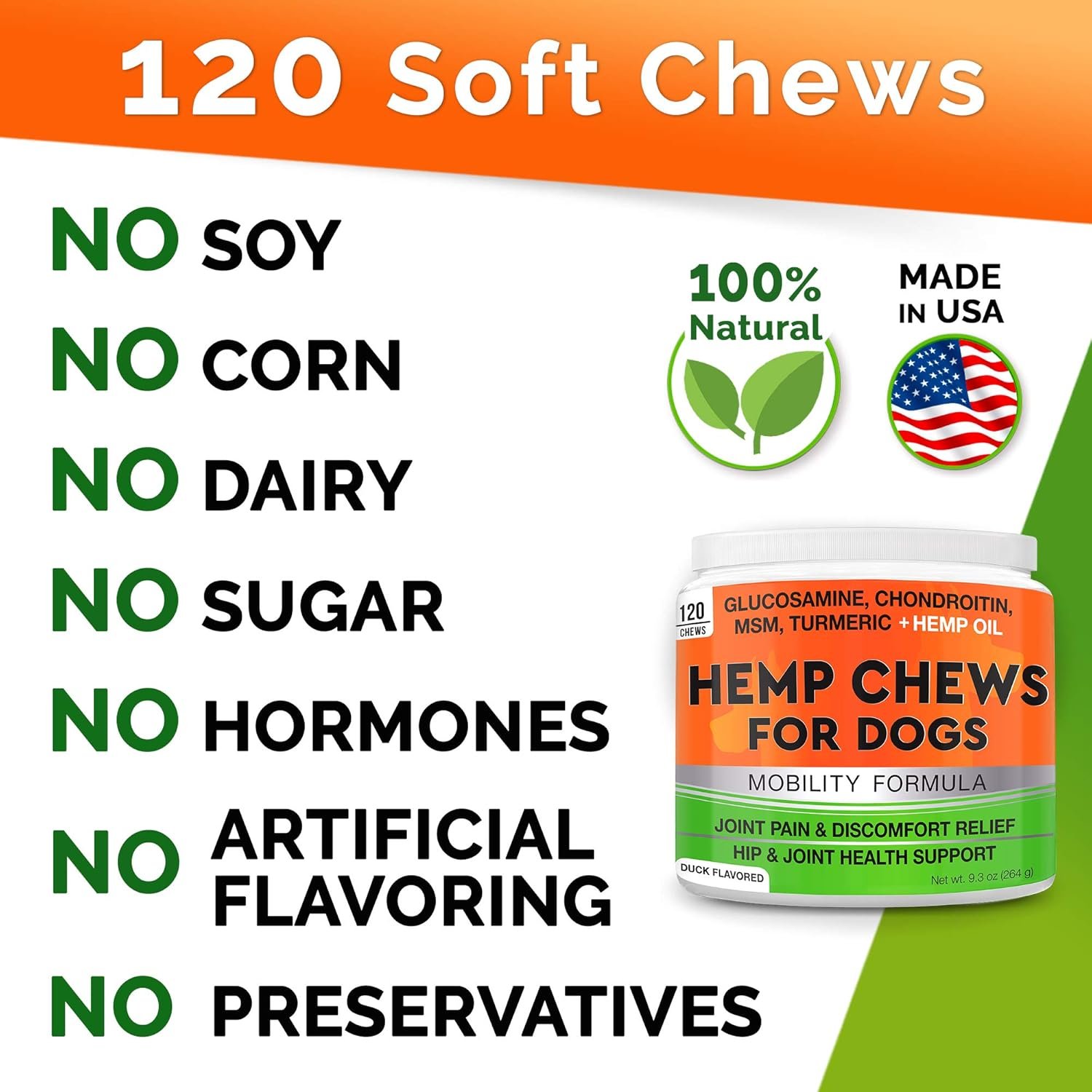 June 9, 2025Hemp Hip & Joint Supplement for Dogs – Made in USA – Glucosamine – MSM – Turmeric – Hemp Seed Oil Infused Treats – Natural Joint Pain Relief & Mobility – 120 Soft Chews